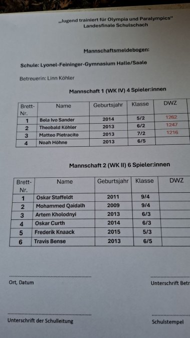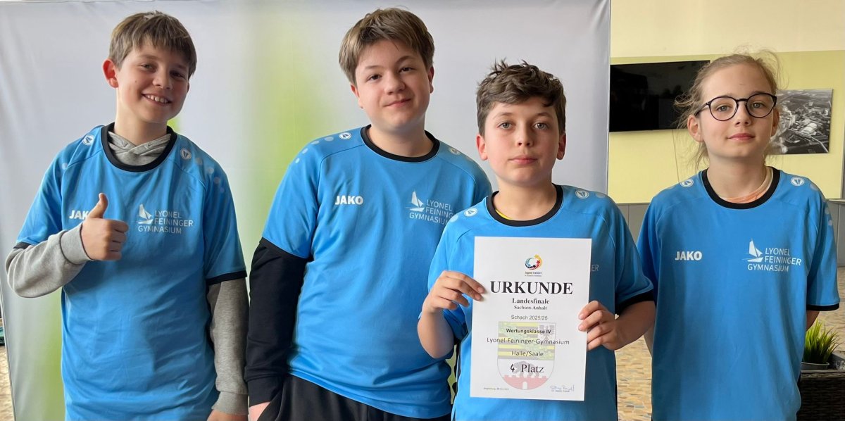 Das Team des Lyonel-Feininger-Gymnasium spielte in der WK IV mit Bela Sander, Theobald Köhler, Matteo Pietracito (alle SV Saalespringer Halle) und Noah Höhne (AG-Mitglied) und erreichte den 4. Platz. Auch dies ist sehr anerkennenswert, da maßgeblich durch Initiative von Linn Köhler (SV Saalespringer Halle) es erst seit diesem Schuljahr eine Schach-AG dort gibt.